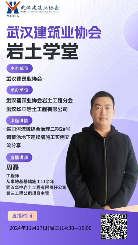 2024年11月27日,由武汉建筑业协会主办,协会岩土工程分会、武汉华中岩土工程有限公司承办的岩土学堂第二期在线举办。我公司周磊为主讲嘉宾,为大家进行了“巡司河流域综合治理二期2#调蓄池地下连续墙施工实例”的分享。